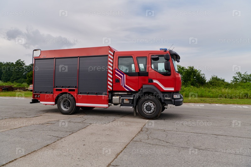 В этой захватывающей сцене современная пожарная машина, оснащенная передовыми спасательными технологиями, стоит наготове вместе со своей опытной пожарной командой, готовой вмешаться и быстро отреагировать на чрезвычайные ситуации, обеспечивая безопасность