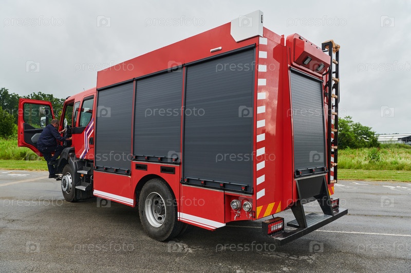 В этой захватывающей сцене современная пожарная машина, оснащенная передовыми спасательными технологиями, стоит наготове вместе со своей опытной пожарной командой, готовой вмешаться и быстро отреагировать на чрезвычайные ситуации, обеспечивая безопасность