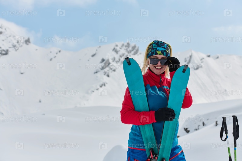 Профессиональная лыжница радуется после успешного восхождения на заснеженные вершины Альп