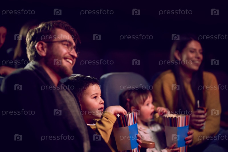 Современная семья наслаждается совместным времяпрепровождением в кинотеатре, наслаждаясь попкорном и просматривая фильм вместе с детьми