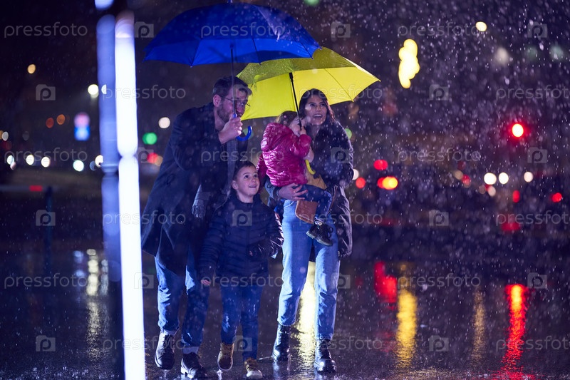 В разгар дождливой городской ночи счастливая пара берет своих детей на прогулку по улицам города, направляясь в кинотеатр для приятного семейного просмотра фильмов