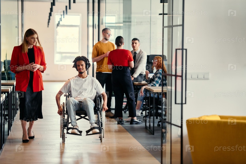 Разнообразная группа молодых специалистов, включая деловых женщин и афроамериканского предпринимателя в инвалидной коляске, совместно обсуждают различные бизнес-проекты в обстановке современного офиса стартапа