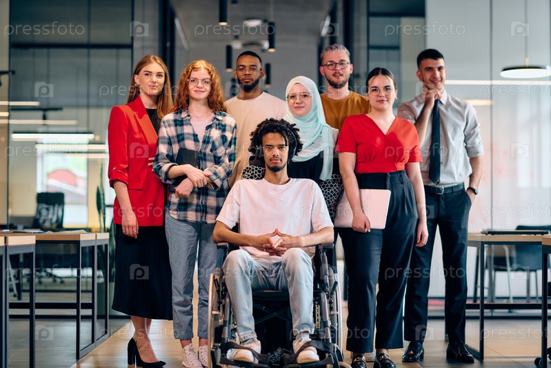 Группа молодых бизнесменов разного пола идет по коридору в застекленном офисе современного стартапа, среди них — человек в инвалидной коляске и женщина в хиджабе