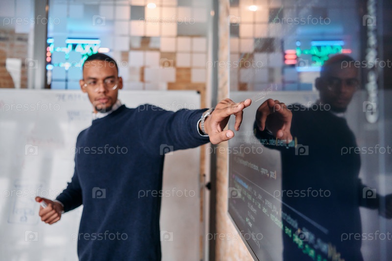 Афроамериканский бизнесмен проводит убедительную презентацию своей бизнес-стратегии для коллег, способствуя сотрудничеству и дальновидному мышлению