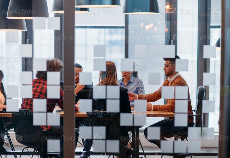 В элегантном стеклянном офисном помещении команда профессионалов бизнеса ведет оживленные дискуссии и обменивается стратегическими идеями, демонстрируя сотрудничество и инновации, лежащие в основе современной корпоративной культуры