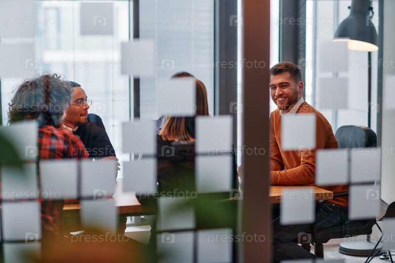 В элегантном стеклянном офисном помещении команда профессионалов бизнеса ведет оживленные дискуссии и обменивается стратегическими идеями, демонстрируя сотрудничество и инновации, лежащие в основе современной корпоративной культуры