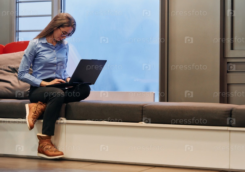 Деловая женщина пользуется ноутбуком, сидя у окна большого корпоративного здания, на фоне которого открывается живописный вид на городской пейзаж