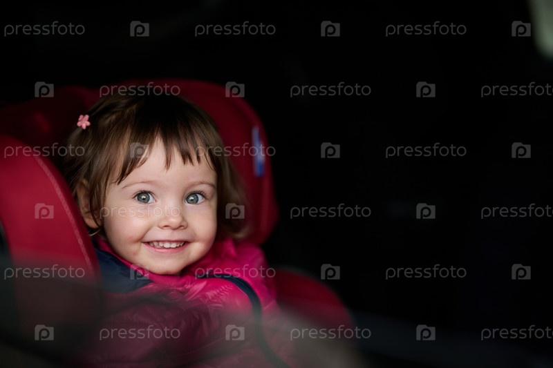 Маленькая девочка удобно сидит в современном автокресле, надежно пристегнутая и готовая к семейному приключению в дороге