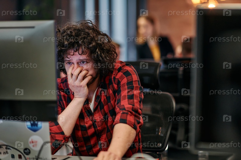 Разочарованный программист с растрепанными волосами смотрит на монитор компьютера в офисе