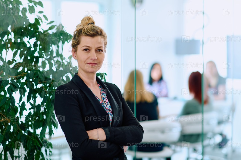 Брюнетка-бизнесвумен со скрещенными руками стоит перед современным офисом