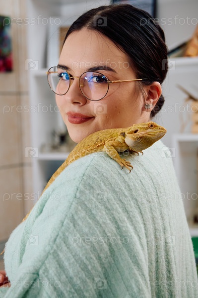 Красивая женщина позирует со своими очаровательными питомцами — бородатыми агамами