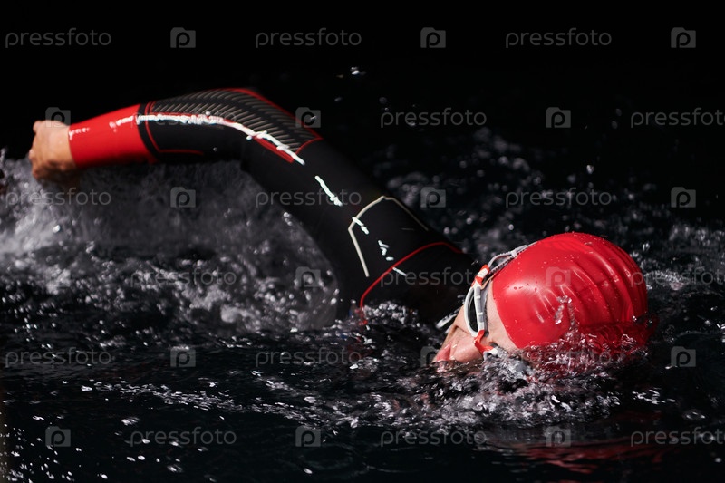 Целеустремленный профессиональный триатлонист проходит интенсивные ночные тренировки в холодной воде, демонстрируя самоотверженность и выносливость в рамках подготовки к предстоящим соревнованиям по триатлону