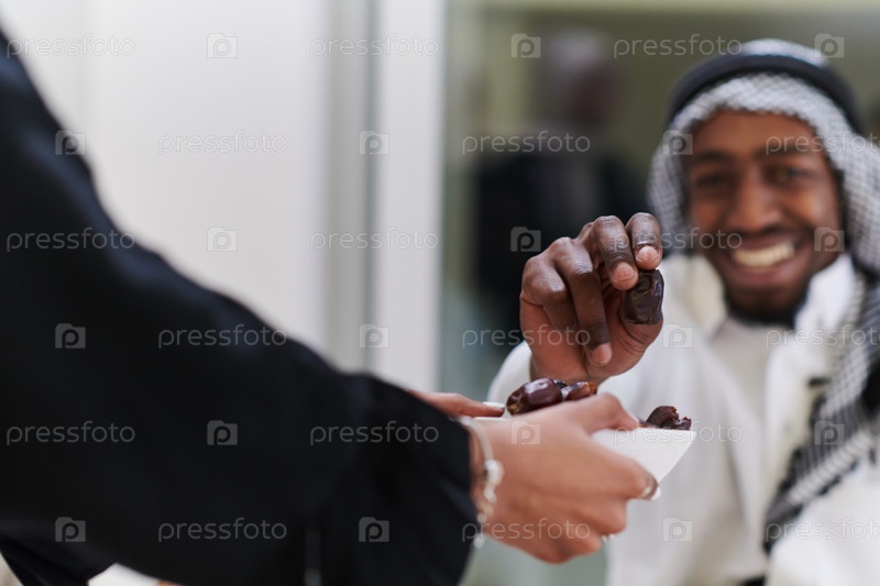 Афроамериканец-мусульманин деликатно берет финики, чтобы прервать пост во время месяца Рамадан, сидя за семейным обеденным столом, олицетворяя сцену духовного размышления, культурных традиций и общего ожидания общественного ифтара