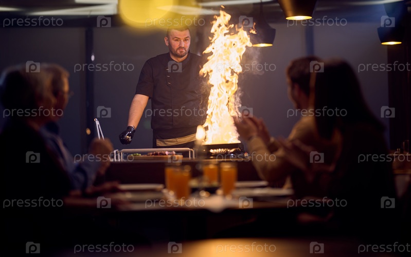 В ресторане профессиональный шеф-повар представляет гостям жареный стейк, приготовленный на открытом огне, в то время как европейская мусульманская семья с нетерпением ждет ифтара во время священного месяца Рамадан, сочетая кулинарное мастерство с культур