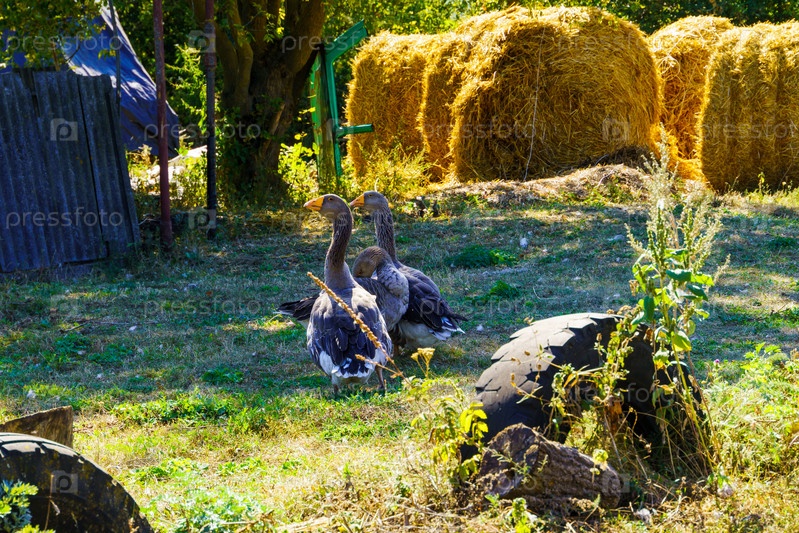 Сельский пейзаж. Гуси на лужайке. Поселок Красная Заря. Орловская область