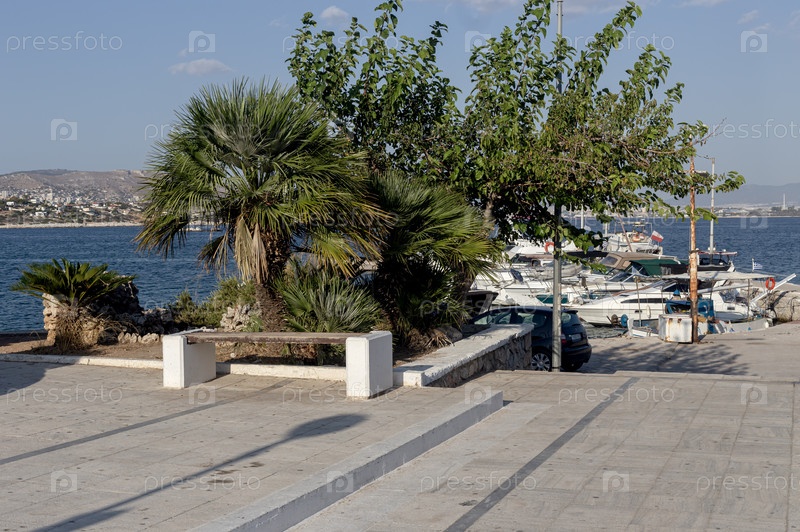 Скамейка у моря на набережной (Греция, остров Саламин)