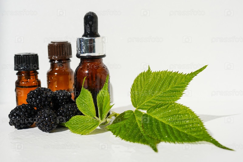 Эфирное масло ежевики во флаконе для ухода за кожей. Экстракт ежевики. Косметический флакон с сывороткой и ягодами ежевики. Эфирное масло. сыворотка для красоты