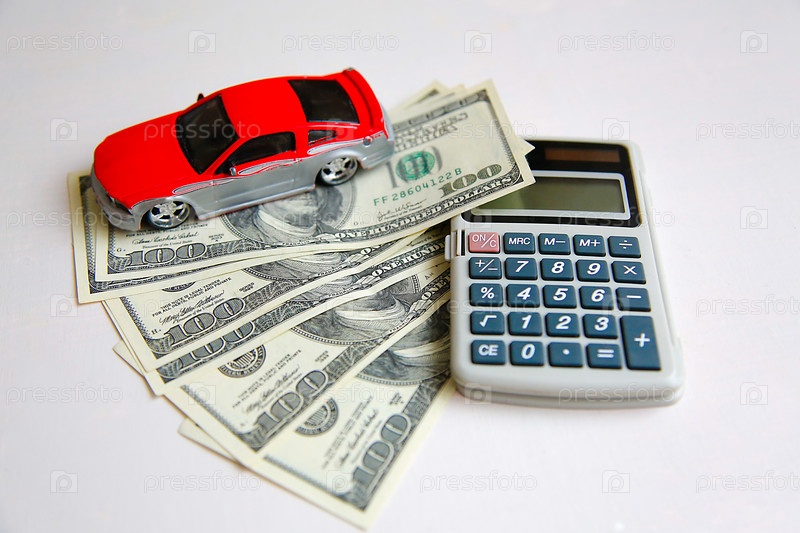 Игрушечная машинка на долларовых купюрах рядом с калькулятором