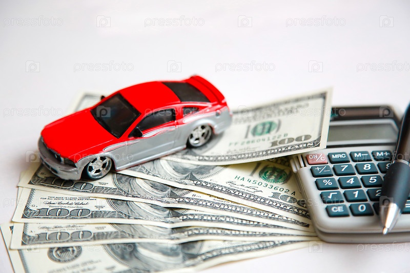 Красная игрушечная машинка, стоящая на стопке долларовых купюр рядом с калькулятором и шариковой ручкой