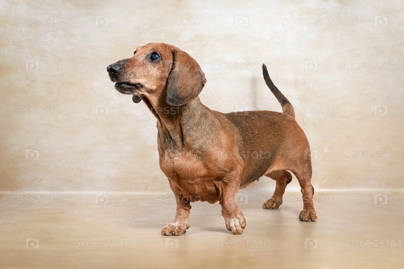 Портрет пожилой коричневой слепой таксы в студии на бежевом фоне