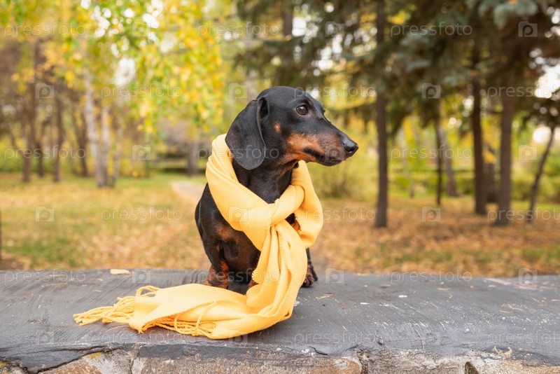 Милая черная миниатюрная такса с желтым шарфом сидит на каменной стене в парке осенью. Размытый фон с деревьями, кустами и осенними цветами создает безмятежную атмосферу