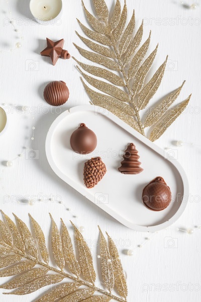 Шоколад в форме елочных игрушек на белом фоне с элементами елочных украшений. Открытка к Новому году