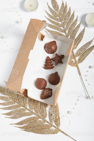 Шоколад в виде елочных игрушек в коробке на белом фоне с элементами елочного декора. Открытка к Новому году