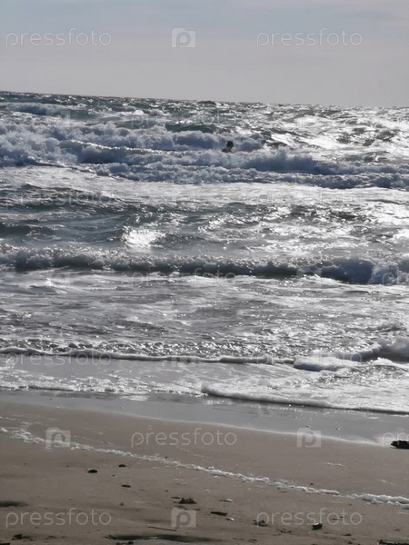 Волны разбиваются о песчаный пляж под ярким небом в дневные часы у побережья