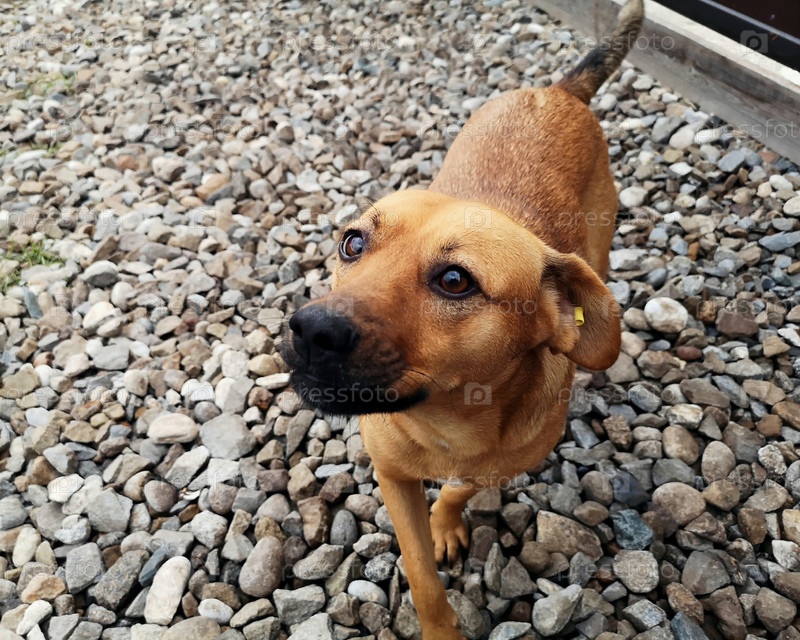 Счастливая собака исследует каменистую местность на открытом воздухе в солнечный день