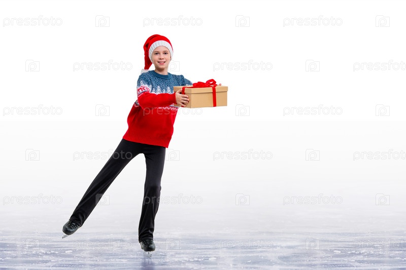 Мальчик-фигурист в шапке Санта-Клауса катается на льду, изолированном на белом фоне. Зимние виды спорта для детей. Рождественская открытка с местом для копирования