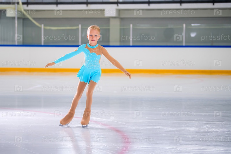Портрет маленькой девочки в полный рост, занимающейся фигурным катанием на крытом катке во время выступления, место для копирования