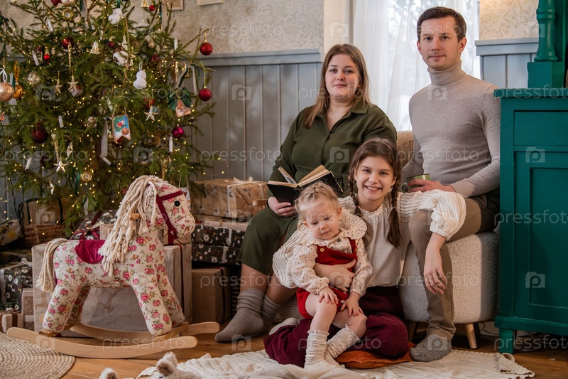 Семья с детьми отдыхает в интерьере загородного дома на фоне новогодней елки