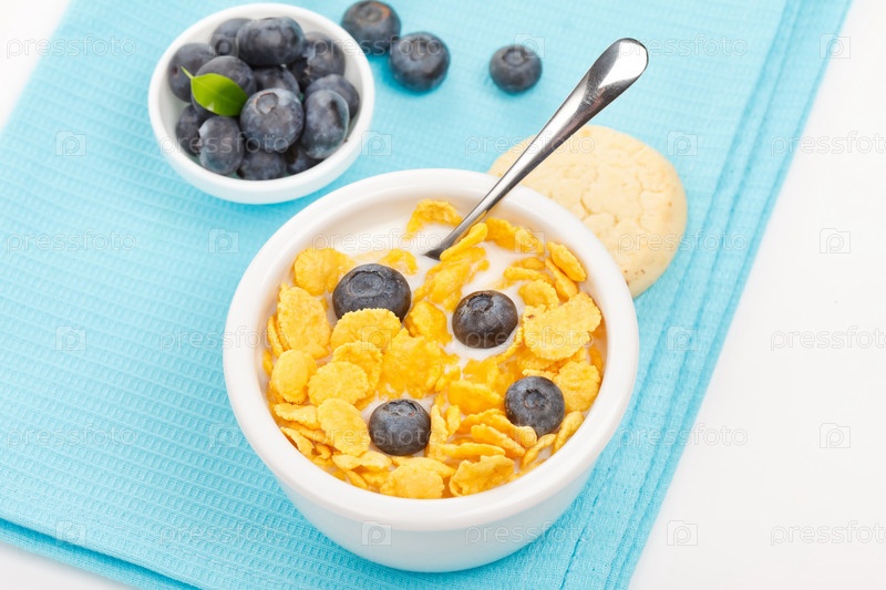 Миска кукурузных хлопьев с молоком и голубикой