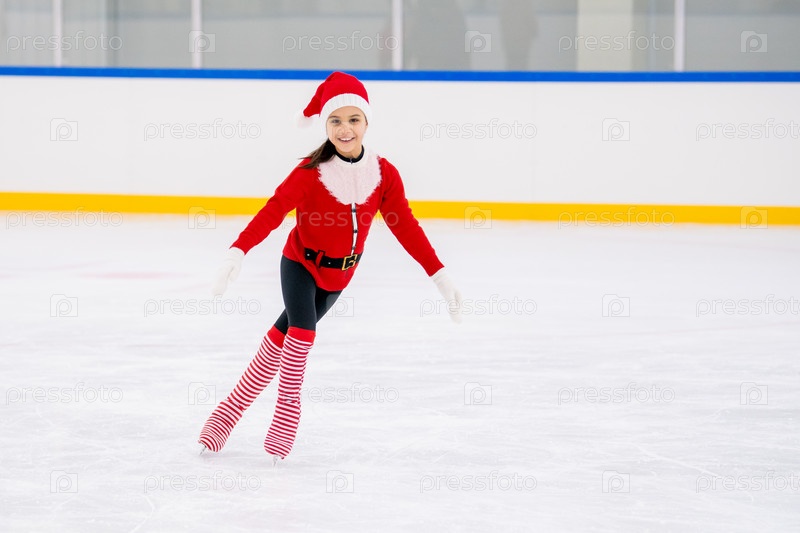 Маленькая девочка-фигуристка в костюме Санта-Клауса катается на льду крытой арены. Рождественский праздник для спортсменов