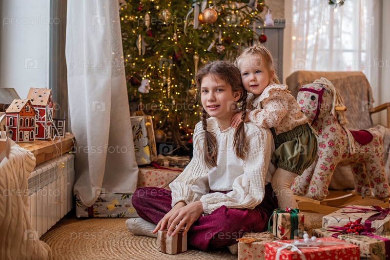 Две сестры сидят рядом с елкой и подарками в интерьере загородного дома. Теплая уютная атмосфера в винтажном стиле кантри