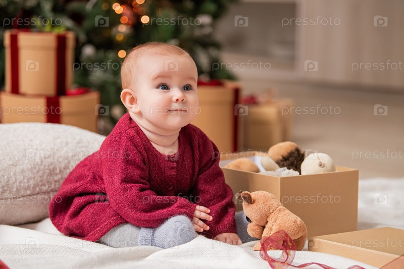 Веселый малыш сидит среди подарочных коробок и игрушек в домашнем интерьере рядом с рождественской елкой