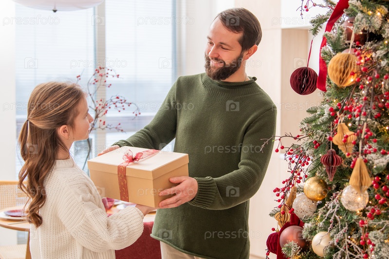 Счастливые отец и дочь весело обмениваются подарками возле елки