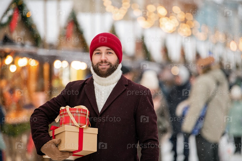 Счастливый улыбающийся мужчина в зимней одежде на уличном рождественском рынке идет с подарками в руках