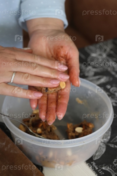 Женщина делает полезное печенье. С орехами и шоколадом. Она формирует тесто. Крупный план