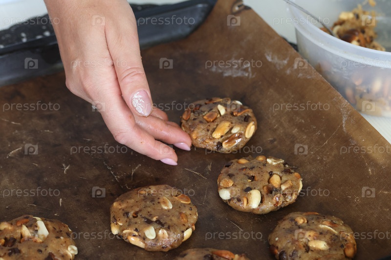 Женщина готовит полезное печенье. С орехами и шоколадом. Она выкладывает порции теста для печенья на противень