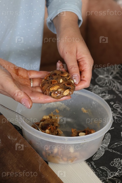 Женщина готовит полезное печенье. С орехами и шоколадом. Она формирует тесто