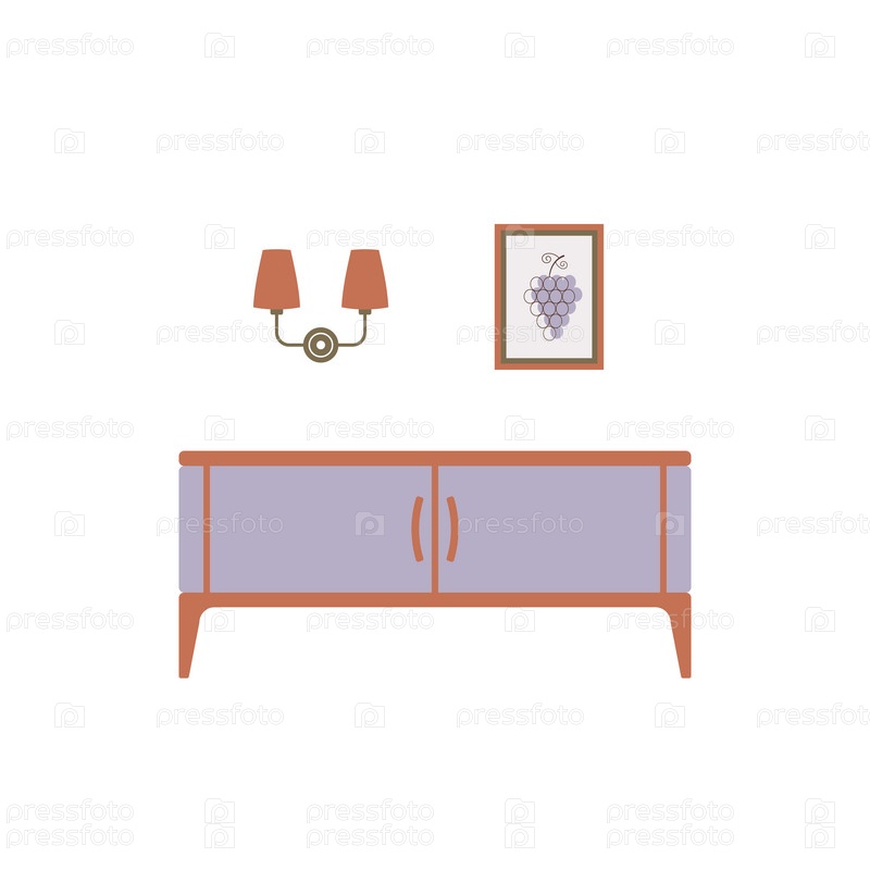 Интерьерная плоская цветная иконка с тумбочкой, настенным светильником и постером с виноградом