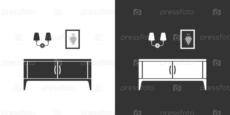 Черная и белая иконка интерьера стумбочкой, настенным светильником и постером в плоском стиле