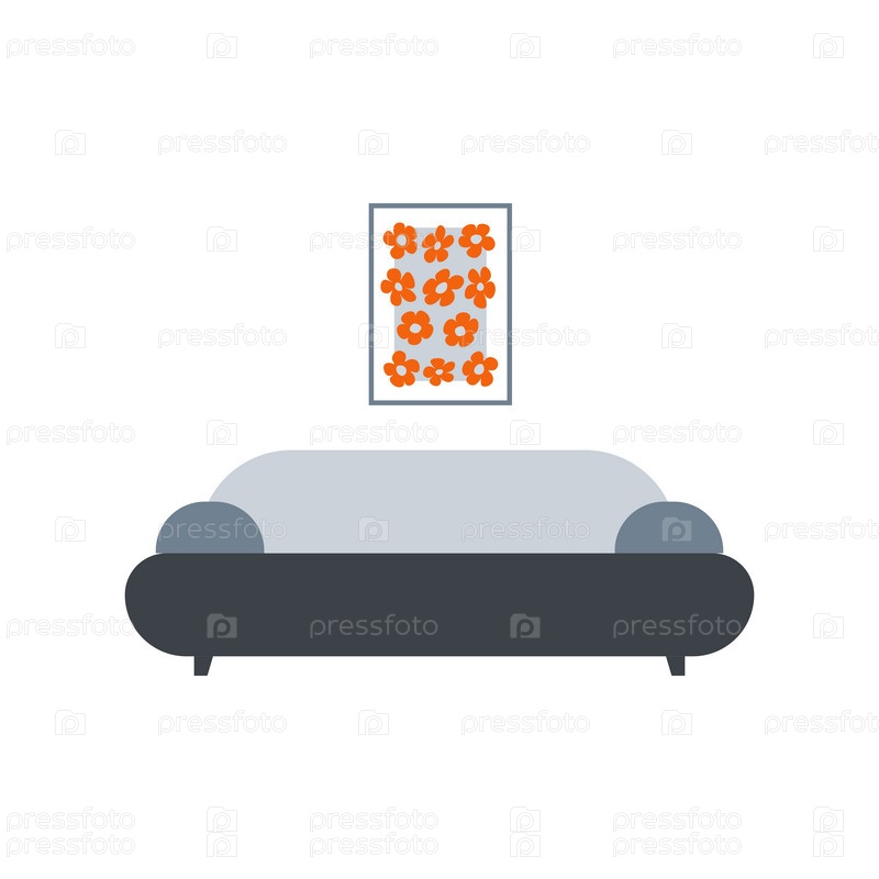 Фрагмент интерьера с диваном и цветочным постером. Мебельная иконка в плоском стиле