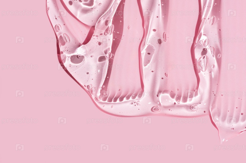 Образец косметического геля на светло-розовой поверхности. Абстрактная текстура геля на розовом фоне