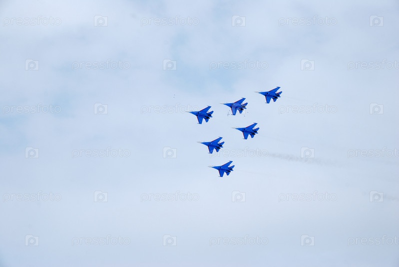 Выступление пилотажной группы «Русские Витязи» на авиашоуОмск, Россия - 19 марта 2016 г.: Выступление пилотажной группы «Русские Витязи» на авиашоу