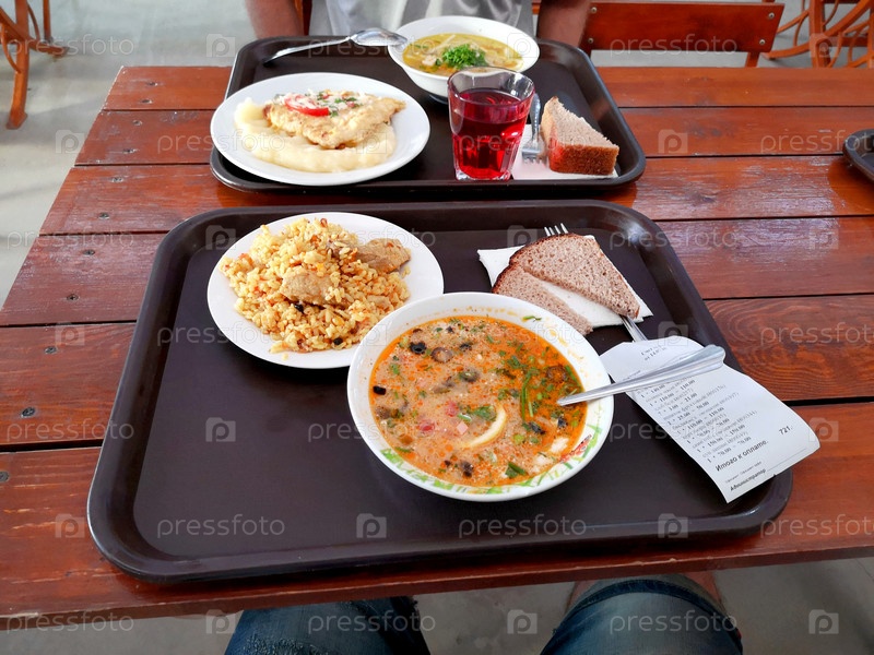 Вкусный обеденный комплексный обед с рисом, супом, хлебом и салатом в уютном кафе в полдень