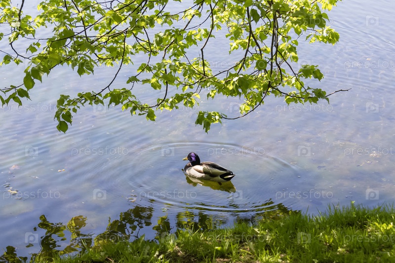 Утка на пруду под нависающими ветвями дерева