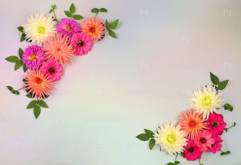 Абстрактная цветочная композиция. Красивый осенний баннер с георгинами, герберами и астрами на светлом фоне, праздничная открытка, сезонный натюрморт Привет, осень, шаблон сезонных цветов,