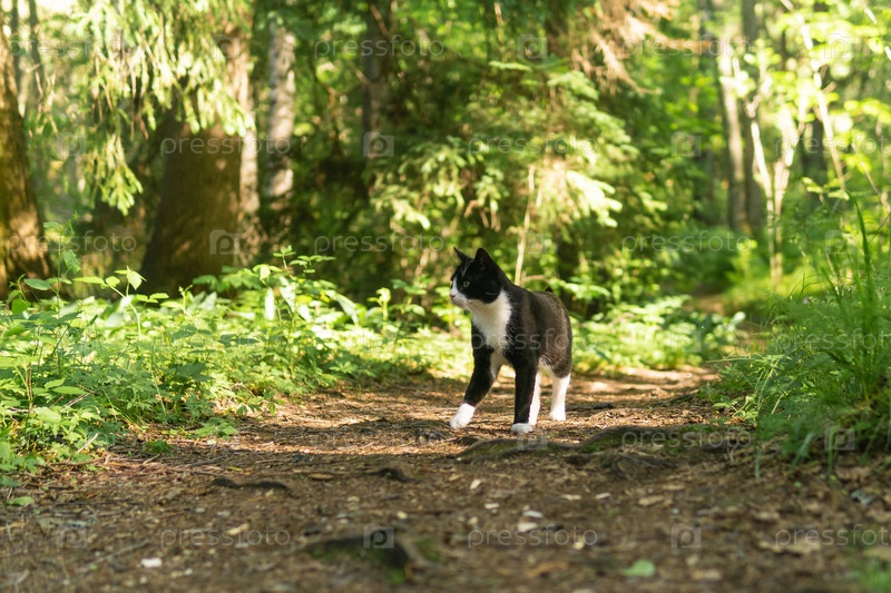 Кот идет по лесной тропинке